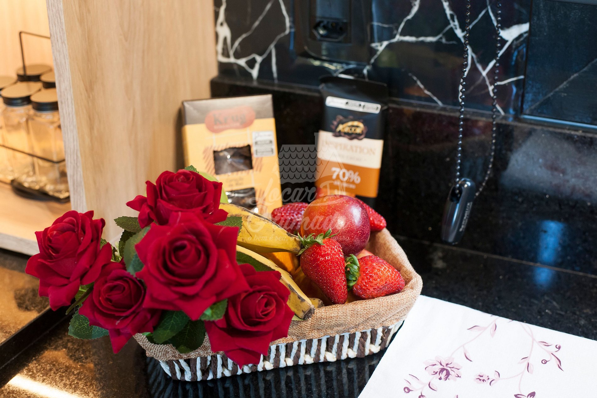 -Deixamos de mimo - Frutas, Chocolate, Biscoito, café em pó.