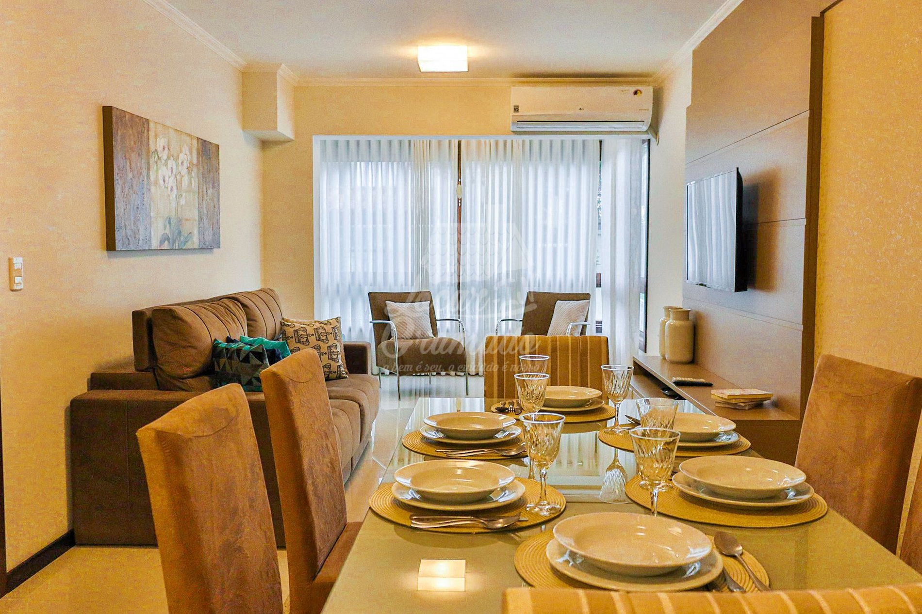 O apartamento é novo, tudo funcionando, ar-condicionado e chuveiros ótimos, cozinha equipada, churrasqueira, tv smart, recomendaria com certeza.